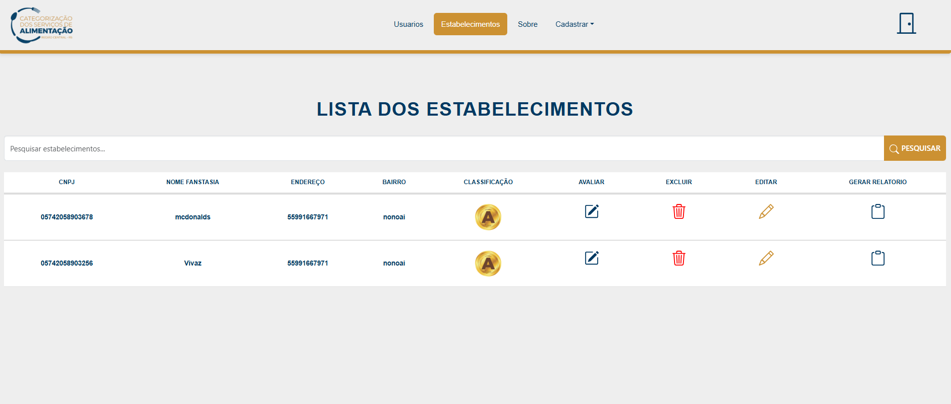 Um sistema onde a vigilancia pode avaliar os estabelecimentos que comercializam alimentos e emitir um selo de classificação